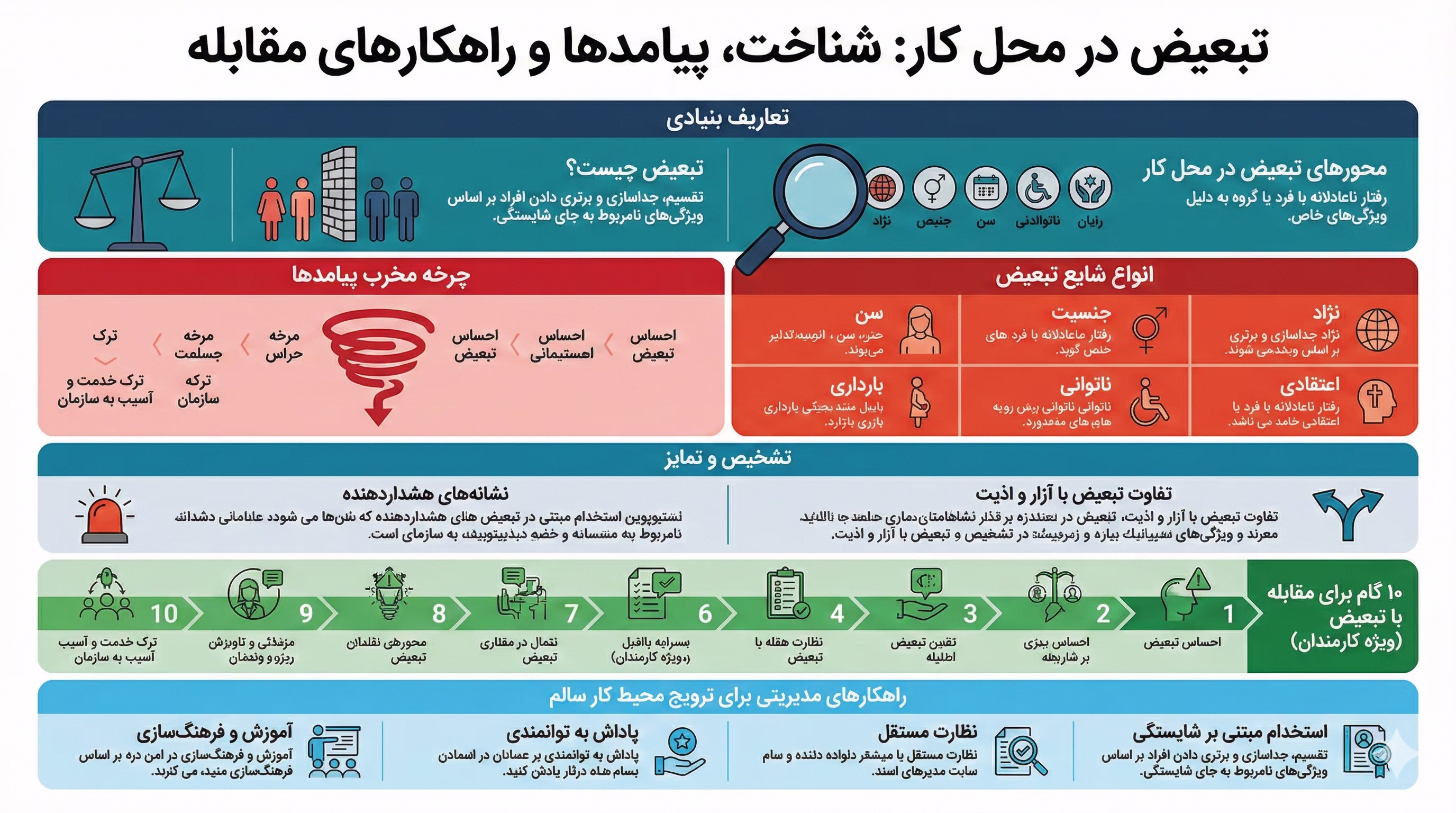 تبعیض انواع مختلفی دارد (مانند تبعیض جنسیتی 🚻، طبقاتی ⚖️ و...) که در درازمدت سبب بیانگیزگی 📉، کاهش اشتیاق شغلی و در نهایت خروج نیروهای ارزشمند از سازمان میگردد. 🚪
